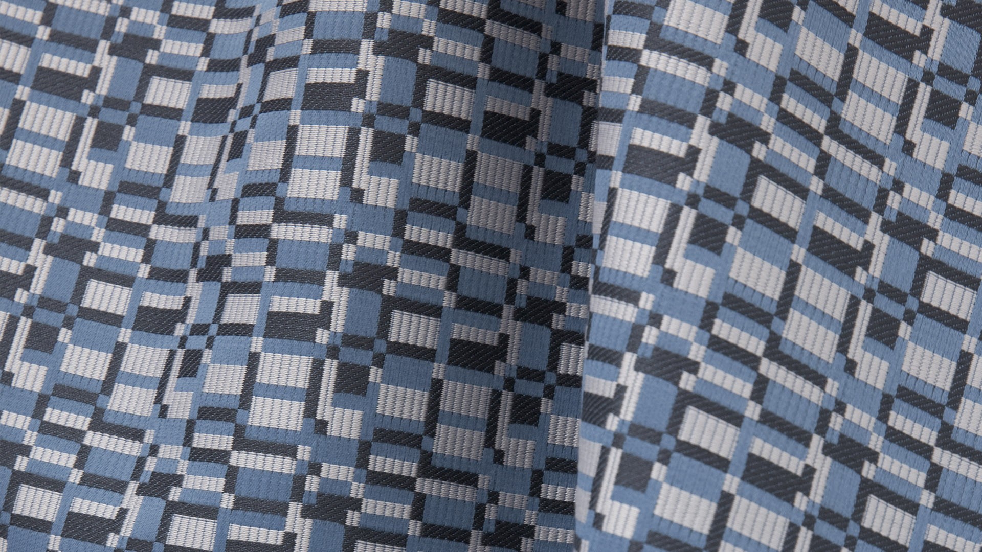 Der Stoff besteht aus 100 % feuerhemmendem Polyester, was Langlebigkeit und Resistenz gegen Abnutzung garantiert. Das Design erinnert an die Struktur von Buchreihen, verleiht dem Raum eine intellektuelle Note und geometrische Strenge. Die Oberfläche ist weich und flexibel, mit einem charakteristischen Spiel aus matten und glänzenden Flächen, was einen eleganten visuellen Effekt erzeugt.