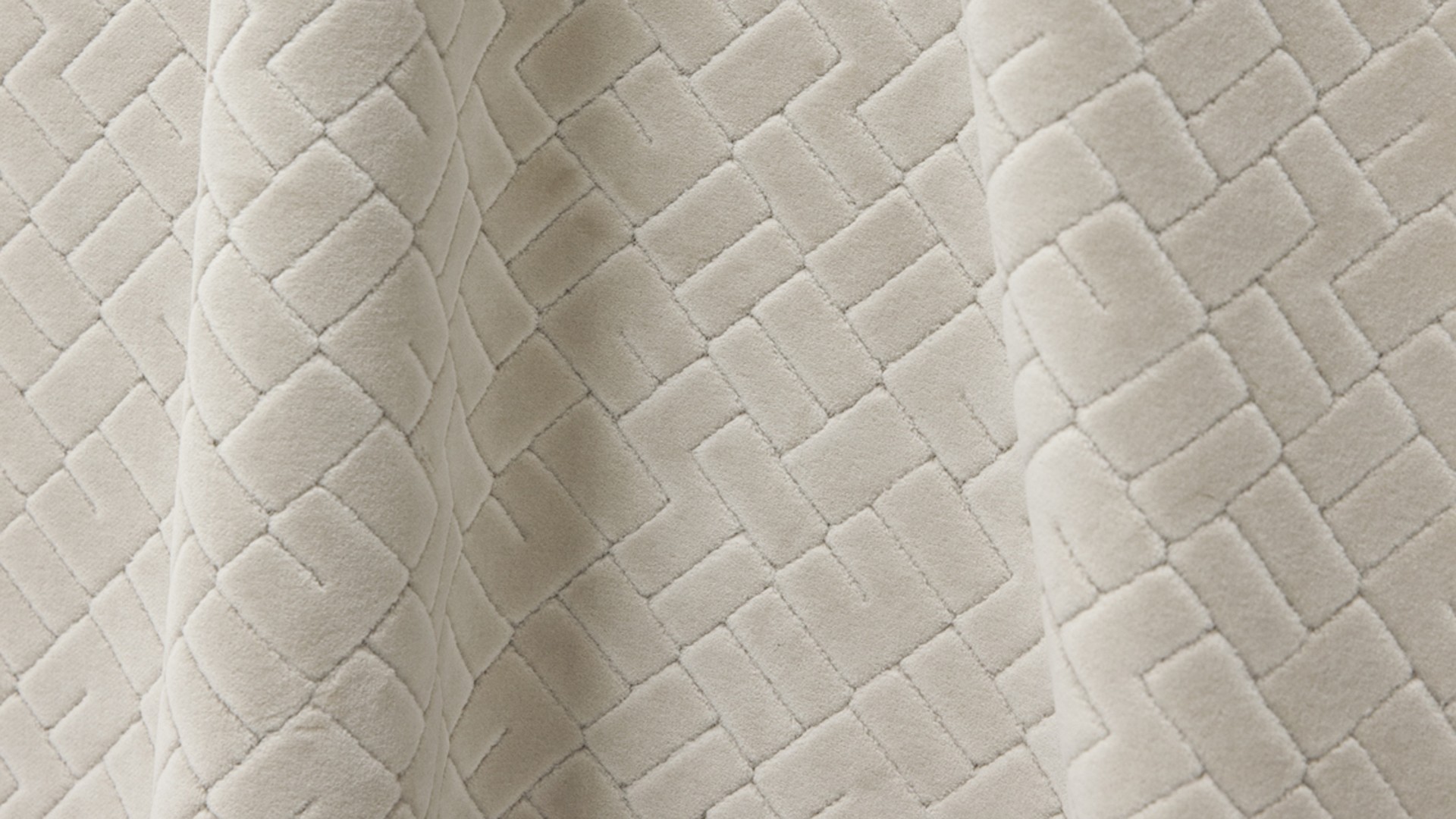 Inspiriert vom legendären französischen Küstenort, berühmt für seine Keramikwerkstätten, spiegelt das Design des Stoffes Vallauris die geometrische Strenge gepflasterter Straßen und die Präzision von Mosaiken wider. Das Jacquard-Muster, sorgfältig in das dichte und weiche Florgewebe eingearbeitet, präsentiert sich in einer kräftigen und intensiven Farbpalette, die an ikonische Vintage-Emaille erinnert.