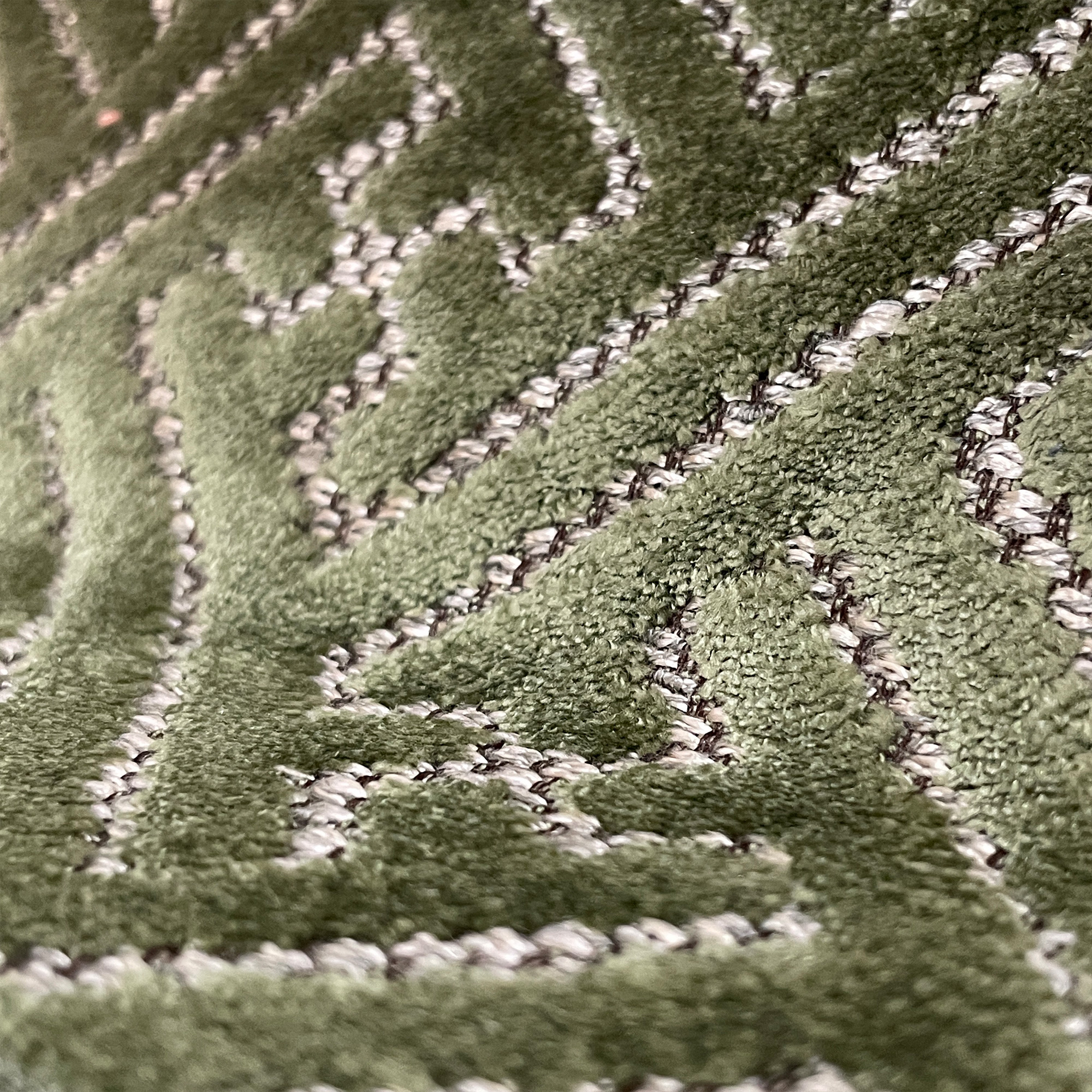 Das Muster erinnert an einen labyrinthartigen Irrgarten, der durch den Webprozess klar und präzise zur Geltung kommt. Zwischen den feinen Linien zeigt sich eine neutrale Bouclé-Struktur mit kurzen Schlingen, die dem Stoff eine besondere Tiefe und Dynamik verleiht.