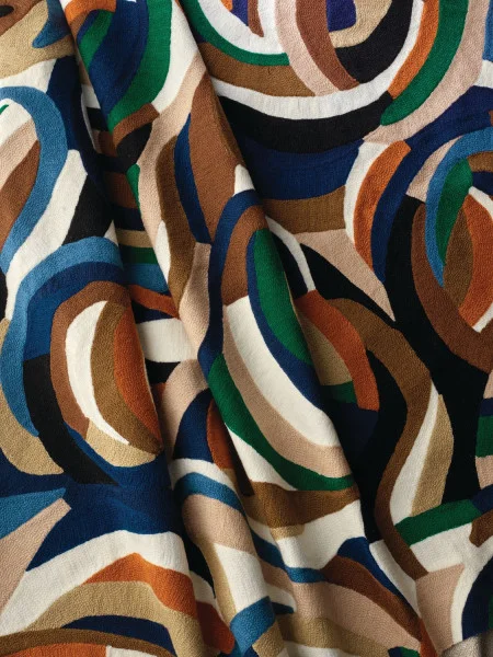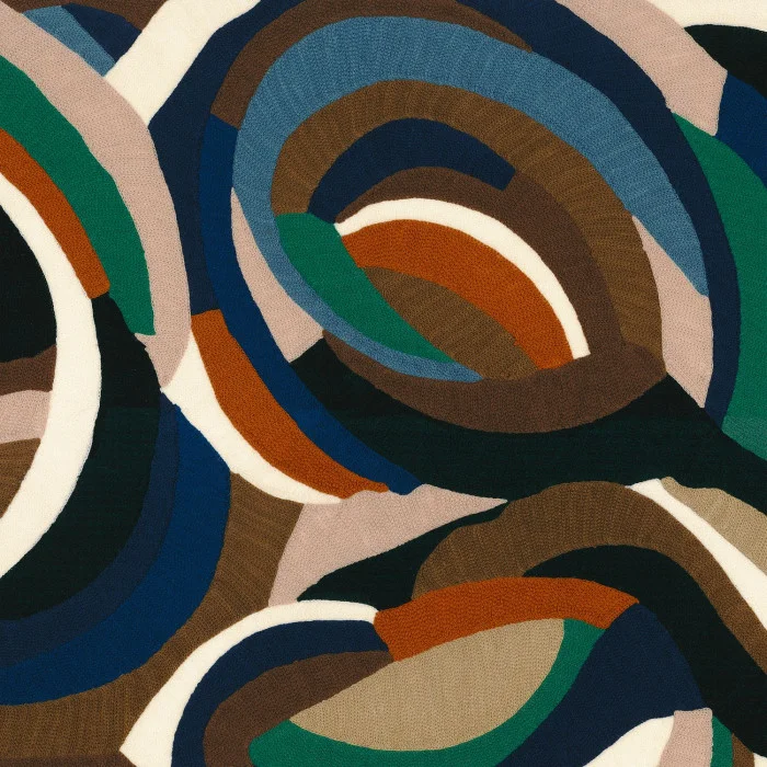 Die Handstickerei wird mit Acrylfäden ausgeführt, die auf eine dichte Baumwollbasis genäht sind und ein beeindruckendes asymmetrisches Muster schaffen. Die Verwendung von 11 verschiedenen Farben der Fäden verleiht dem Stoff Tiefe und Reichtum in den Farbtönen. Das Design wird durch eine traditionelle Veredelung mit einem Holzhammer perfektioniert, was die Gleichmäßigkeit der Sticknähte verbessert und dem Stoff eine weiche, fließende Drapierung verleiht.