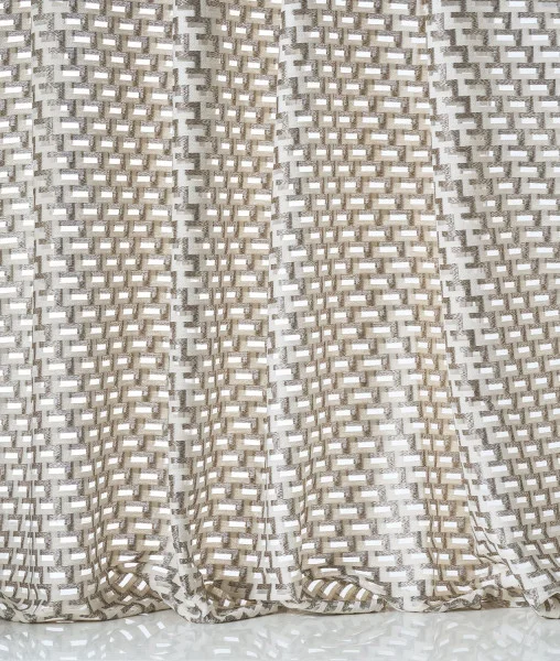 Der Stoff Monte solaro von MISIA Paris ist ein natürlicher Material für Vorhänge mit einem einzigartigen Muster aus wiederholten geometrischen Figuren. Die Kombination aus 79 % Baumwolle, 12 % Viskose und 9 % Polyester sorgt für eine dichte, strukturierte Textur, die einen hochwertigen und voluminösen Eindruck vermittelt. Mit einer Breite von 328 cm ist dieser Stoff besonders praktisch für beide Einsatzmöglichkeiten — Vorhänge und Dekoration.