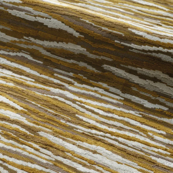 Die Technik cut‑and‑uncut looped erzeugt abwechselnd horizontale Streifen: manchmal flauschig und diffused, manchmal scharf ausgeschnitten, was die Textur des Stoffes lebendig und vielschichtig macht. Der impressionistische visuellen Effekt – vierfädige Garne formen „Gemälde“, die je nach Betrachtungswinkel variieren.