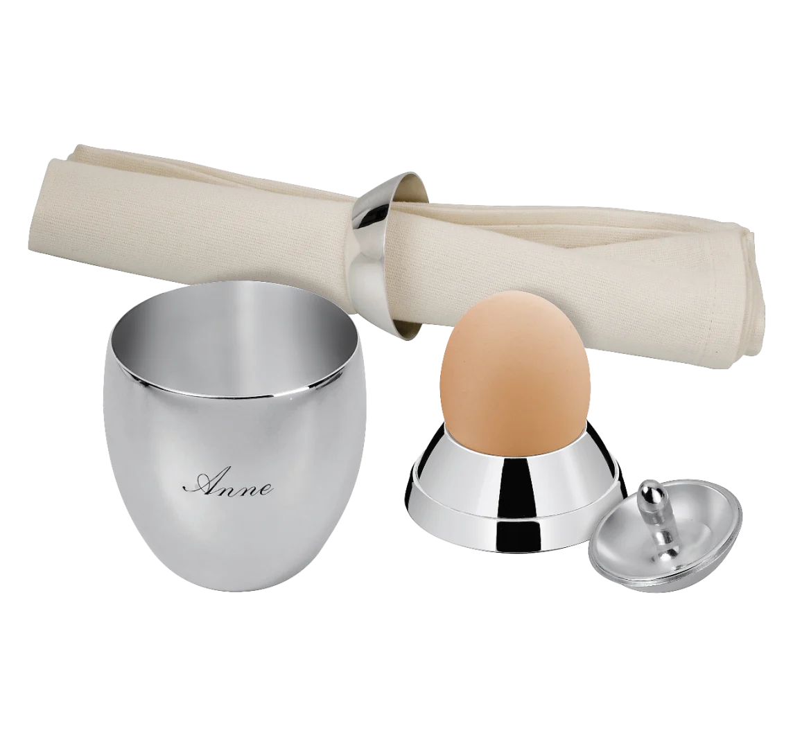 | Zusätzliche Eigenschaften: | Set - Eihülle, Babybecher, Eierbecher, Serviettenring & Kreisel versilbert |