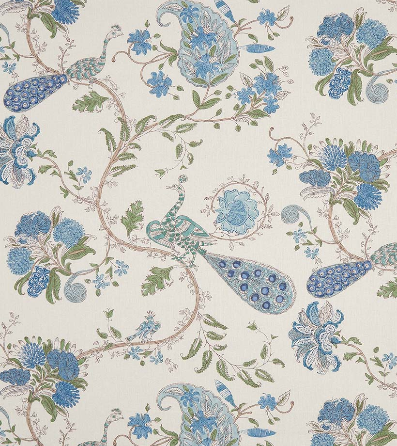 Parvani von Nina Campbell ist ein handgeblockter indischer Wandbehang aus dem neunzehnten Jahrhundert diente als Inspiration für dieses verschlungene Muster aus Pfauen, Blumen und Paisley-Formen. Gedruckt auf einem Leinen-Baumwoll-Köper.