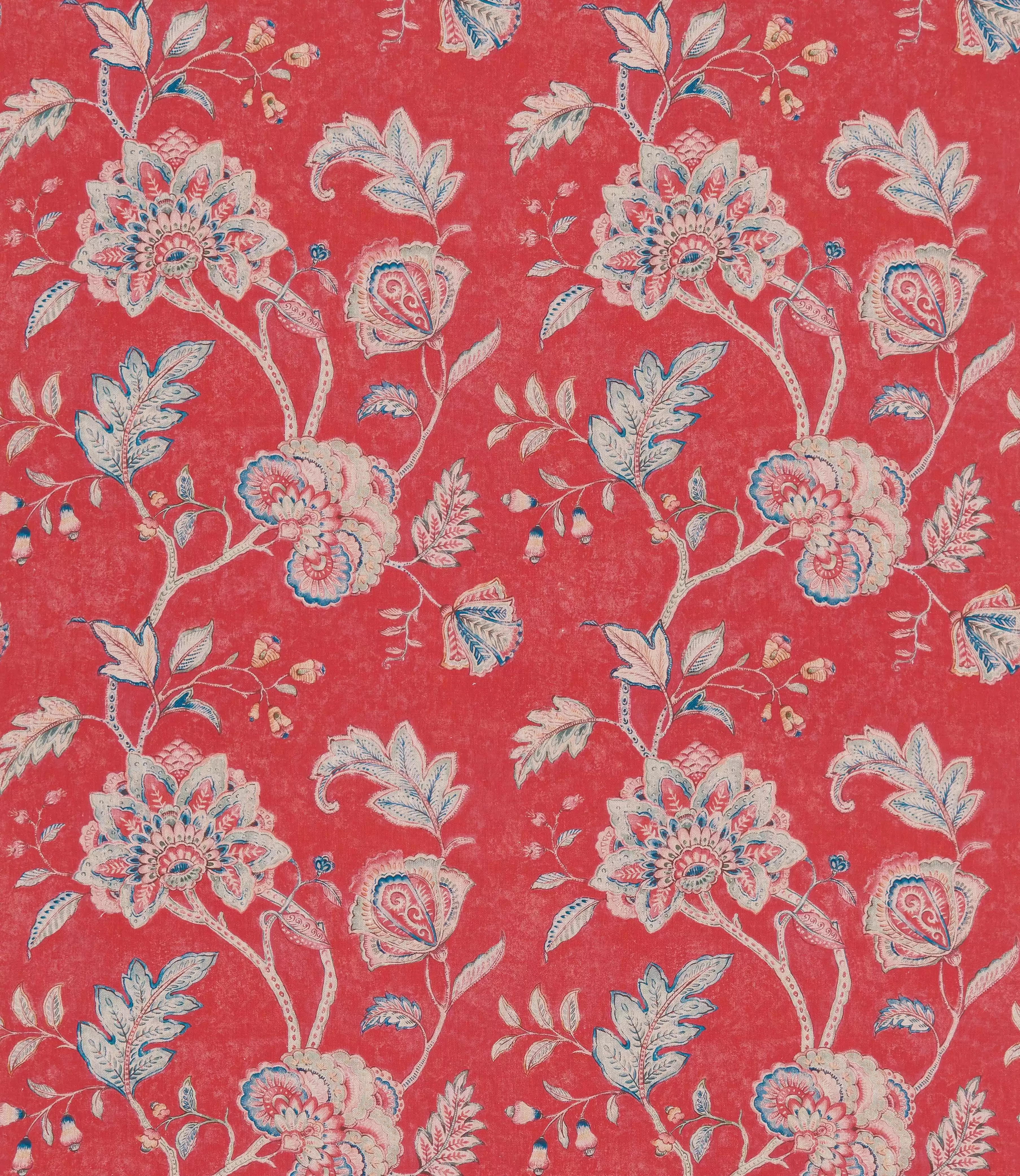 Das von den Textilien Südostindiens inspirierte Lebensbaum-Motiv ist in einer sanften, malerischen Weise umgesetzt und auf ein Leinen mit Fischgrätmuster gedruckt, das eine moderne Interpretation des traditionellen Chintz darstellt.