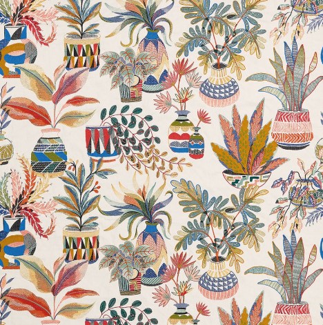 Tudeley-Stoff von Nina Campbell aus einer Mischung von Baumwolle, Leinen, Viskose und anderen Materialien. Verspielte, bestickte Komposition mit bunten Töpfen und Vasen, die mit geometrischen Mustern verziert und mit üppigem Blattwerk geschmückt sind.