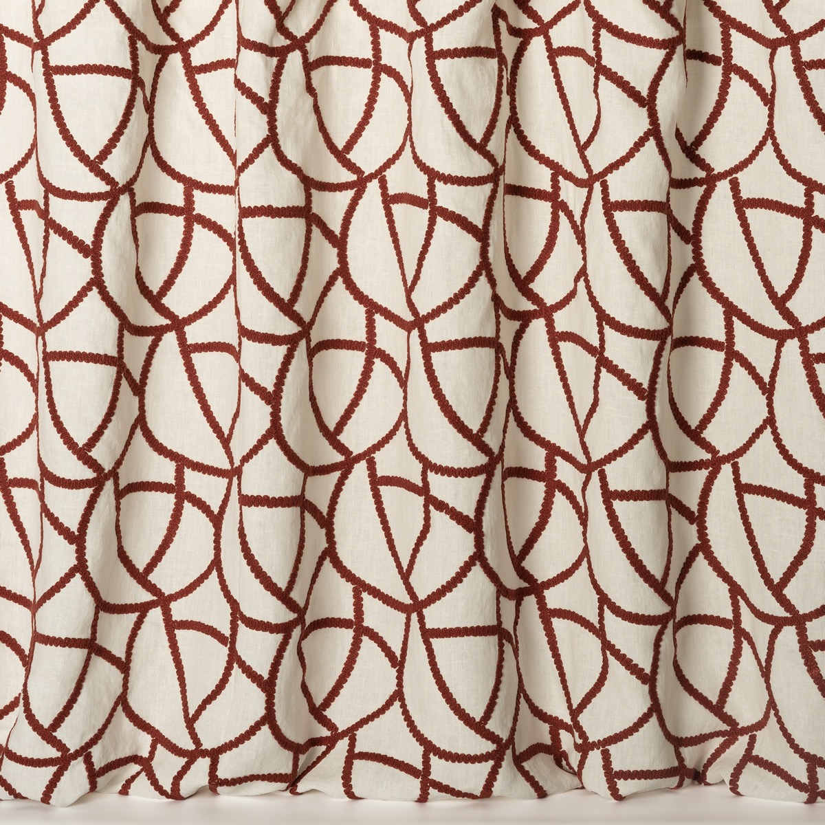 Die bestickten Kordeln verleihen Fréjus einen schweren und vollen Faltenwurf, während die regelmäßige Verflechtung ein großes Netz bildet, das mal Ton in Ton, mal kontrastreich ist. Diese große Breite kann in beide Richtungen verwendet werden. 270 cm Nutzbreite.