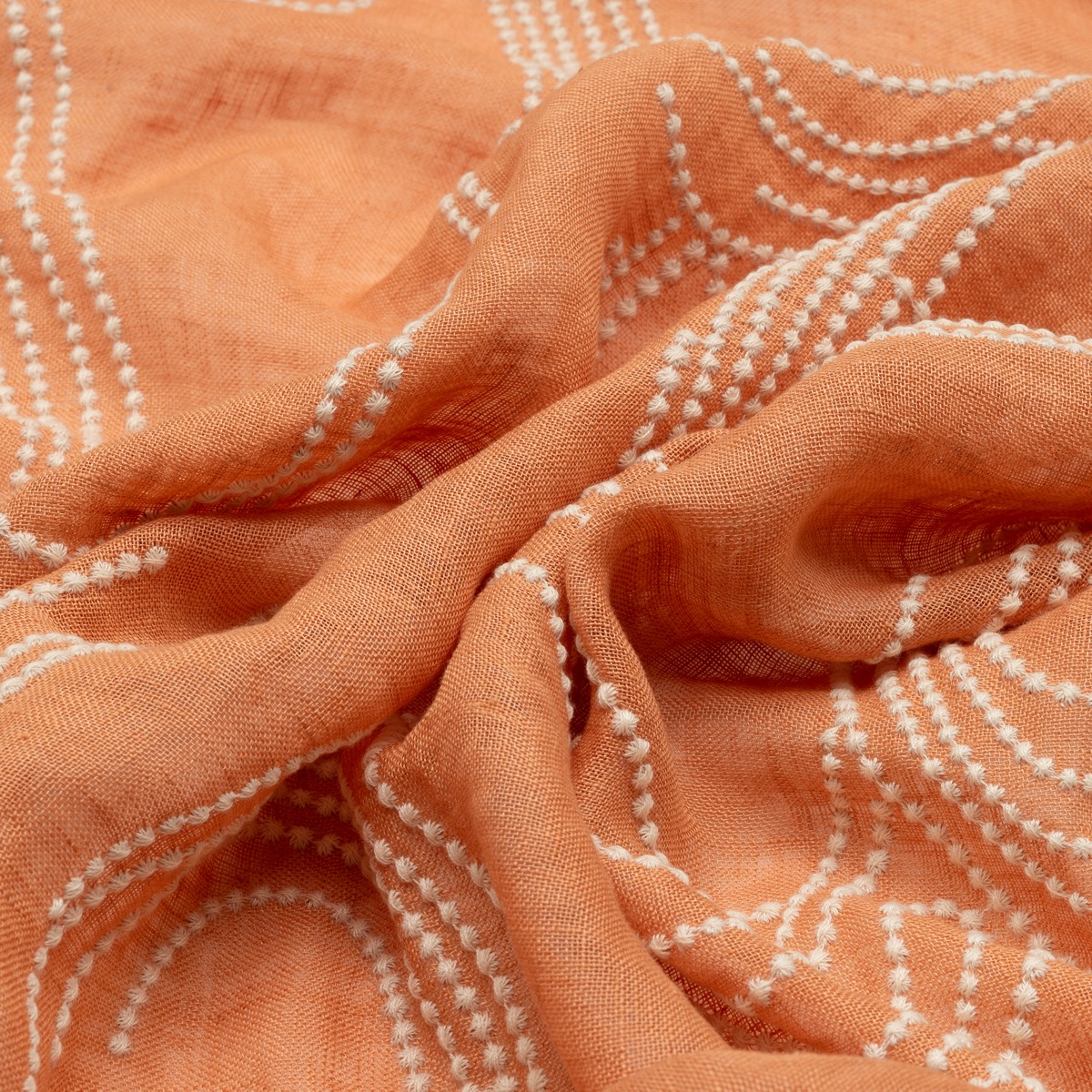 Die gepunktete Stickerei von Maddalena entfaltet sich wie leichte Voluten auf einem Hintergrund aus 100% Leinen. Diese breite Leinenstickerei ist auf Hintergründen in Ocker- und Lehmtönen erhältlich. Diese Breite kann in beide Richtungen verwendet werden. 278 cm Nutzbreite.