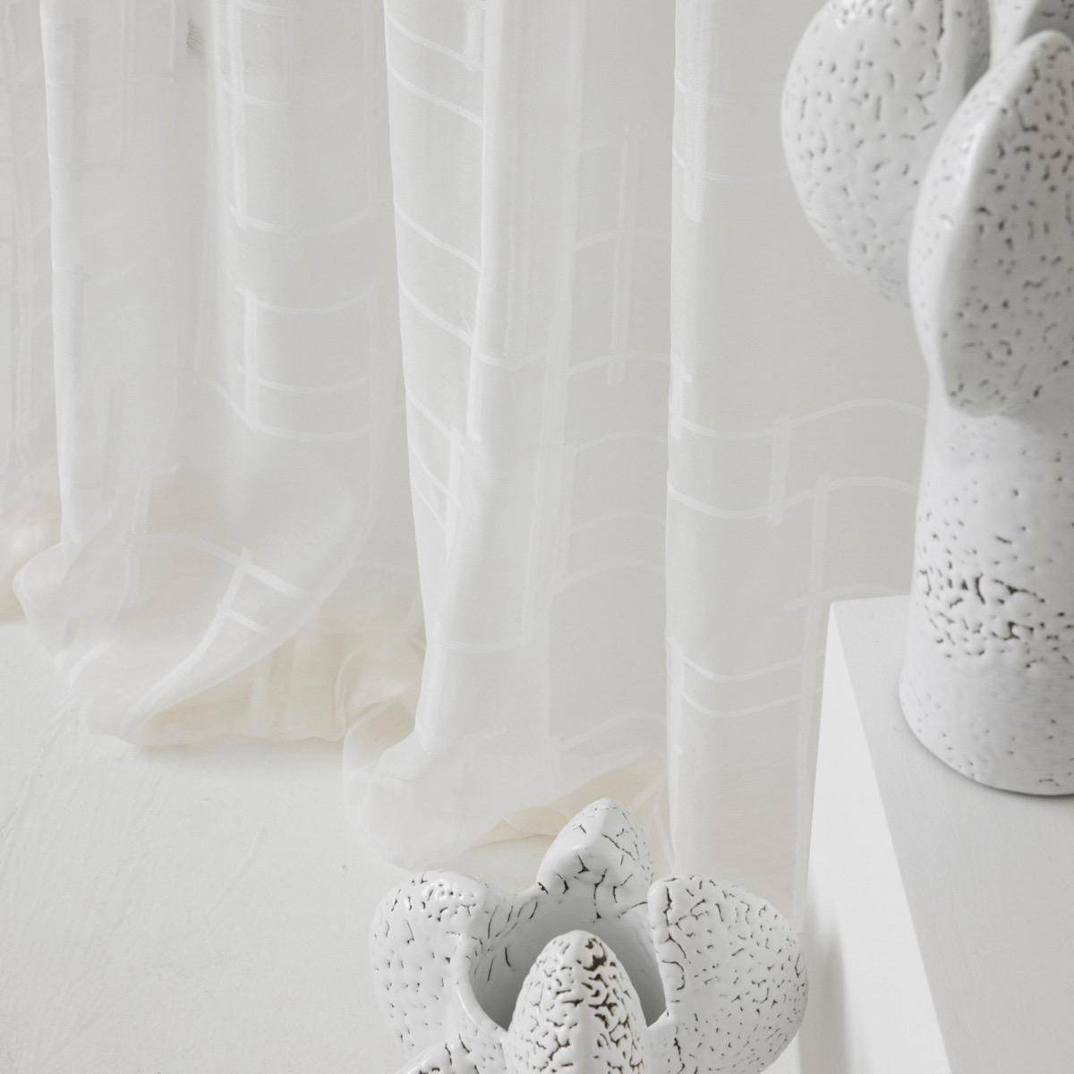 Piloti sheer is a fil coupé jacquard with a delicate graphic of juxtaposed lines. This wide width can be used both directions.