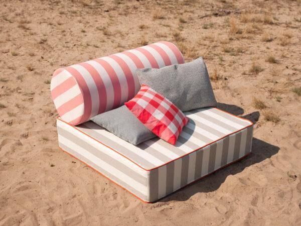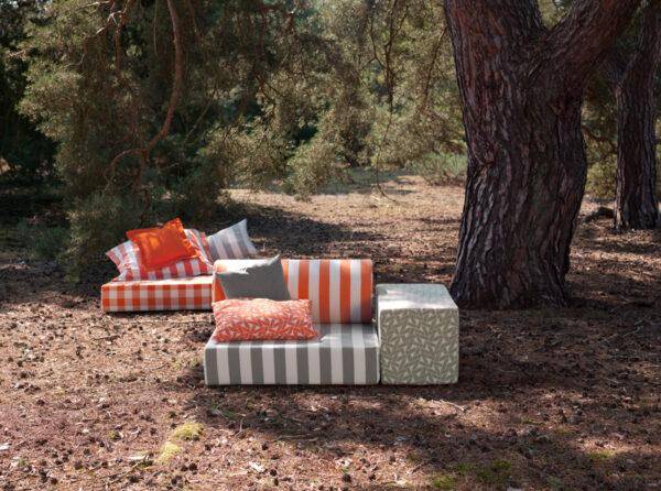 Trotz seiner robusten Outdoor-Qualität besitzt der Stoff eine angenehme Haptik und eignet sich besonders gut für großformatige Kissen, Sitzpolster oder Abdeckungen.
