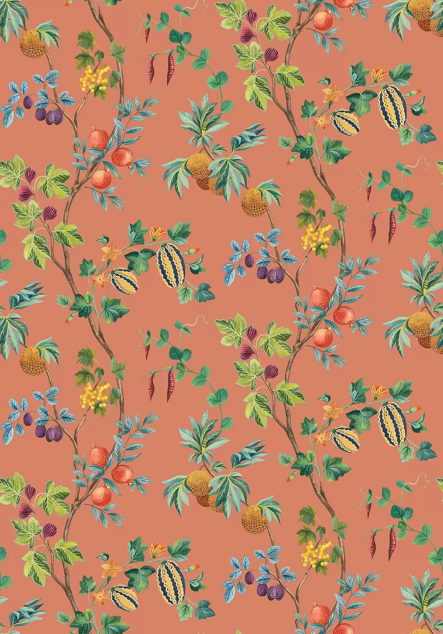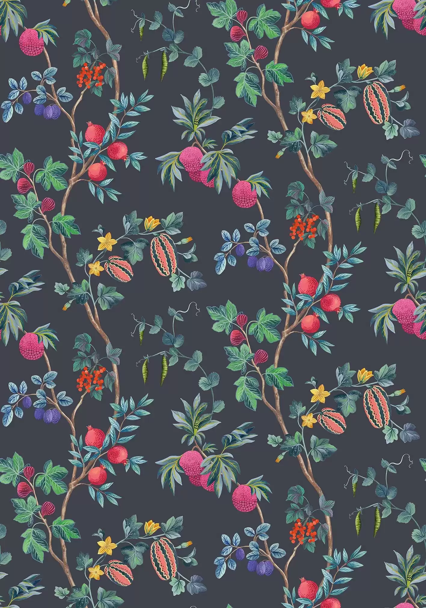 Orchard von Osborne & Little zeigt Granatäpfel, Feigen, Johannisbeeren, Pflaumen, Brotfrüchte, Melonen und Zuckererbsenschoten sind in einem farbenfrohen Schleppendesign angeordnet.