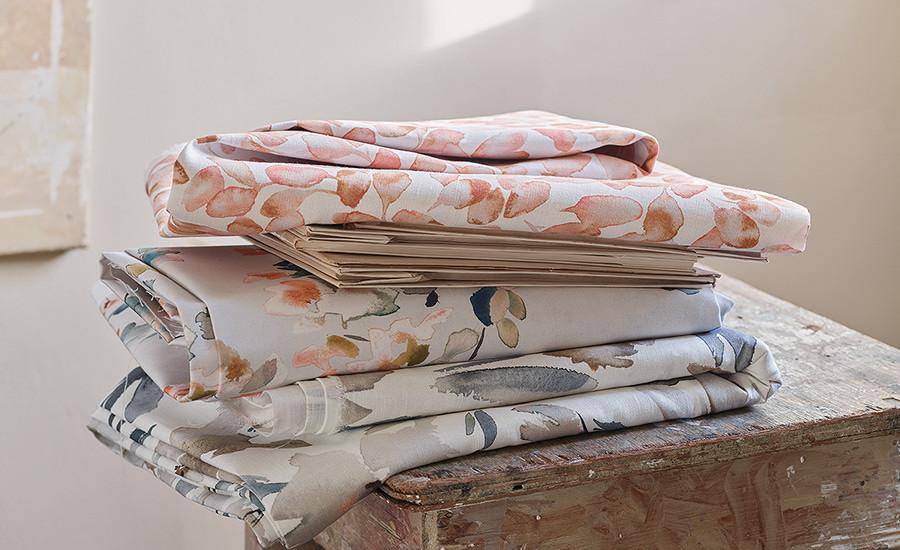 Verstreute Blätter mit einer bezaubernden Farbbewegung bilden ein organisches, multidirektionales Design, das auf einen fein strukturierten Grund mit einer schönen, fühlbaren Oberfläche gedruckt ist.