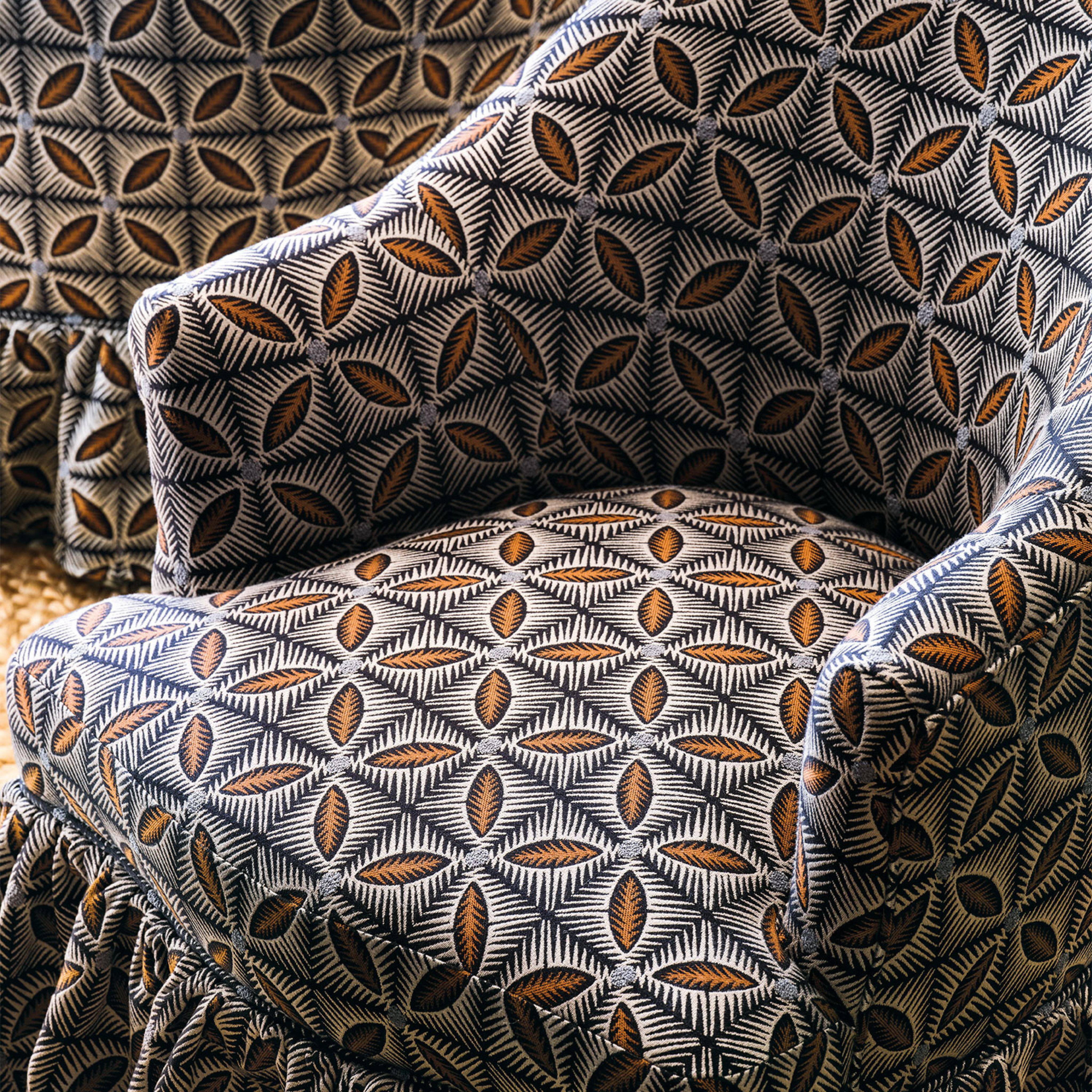 Effie zeichnet sich durch ein dekoratives Jacquard-Gewebe mit geometrischem Motiv aus, das dem Stoff eine raffinierte Textur und Ausdruckskraft verleiht. Die Farbtöne wurden sorgfältig ausgewählt, um sich harmonisch in verschiedene Einrichtungsstile einzufügen und dem Raum Tiefe und Charakter zu verleihen.