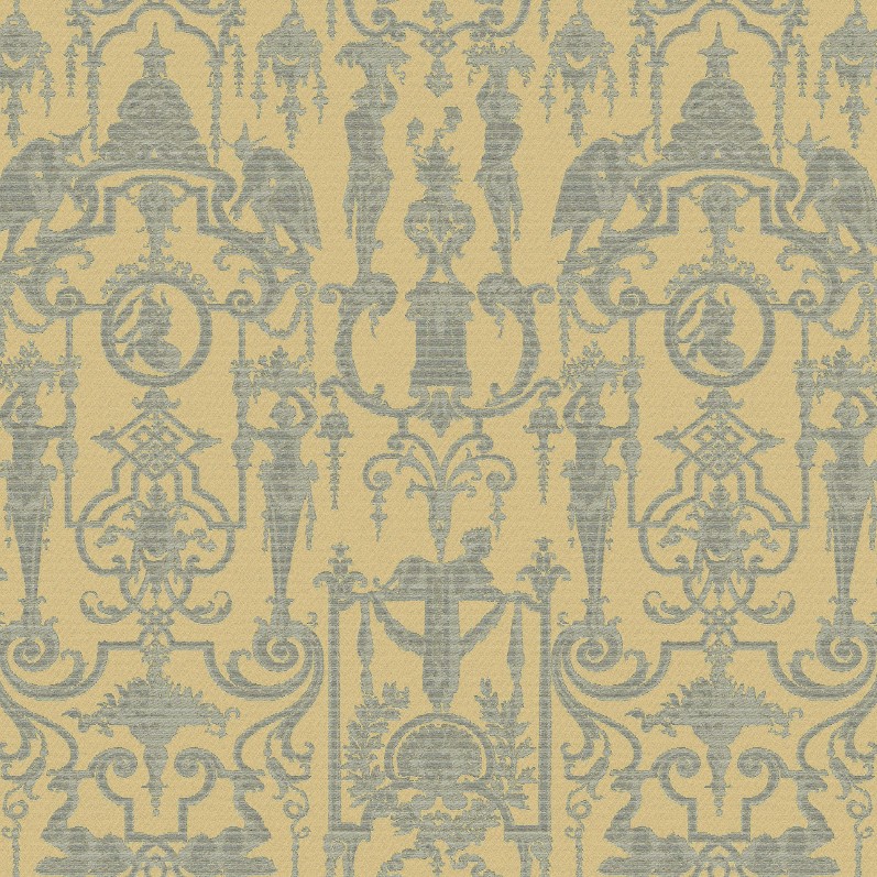 Aida von Rubelli Venezia ist ein Seidenstoff, dessen Dekoration sich aus verschiedenen typischen Elementen des klassischen Repertoires zusammensetzt, die auf angenehme Weise mit anderen kombiniert werden, die auf den Geschmack des Exotischen und der Chinoiserie verweisen. Motive aus der klassischen orientalischen Kleidung erscheinen neben Telamonen, Masken und Gesimsen. Mit seiner metallischen Bindung und dem Glanz des Seidengrundes ist der Lampas Aida Ausdruck einer raffinierten und eleganten Ornamentik, die für die ersten Jahrzehnte des 18. Auch die Farbgebung wurde der typischen klassischen Palette entnommen.