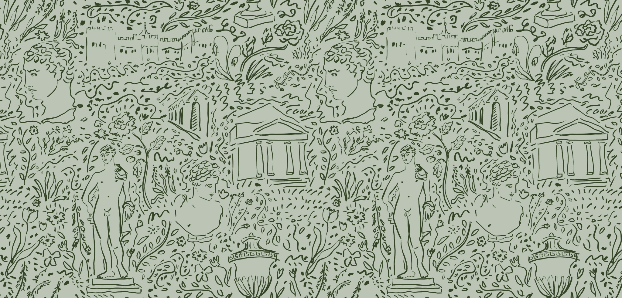 Skizzen eines arkadischen Gartens, inspiriert durch das wunderbare Rousham House and Gardens, Oxfordshire. Ich besuche diesen Garten in meiner Nähe auf dem Lande so oft ich kann. Es ist ein klassisches Paradies, eine geheimnisvolle und antik anmutende Landschaft mit Grotten, Teichen und bröckelnden Statuen. Druck auf einem Leinen- und Baumwollgrund. Geeignet für Polstermöbel.