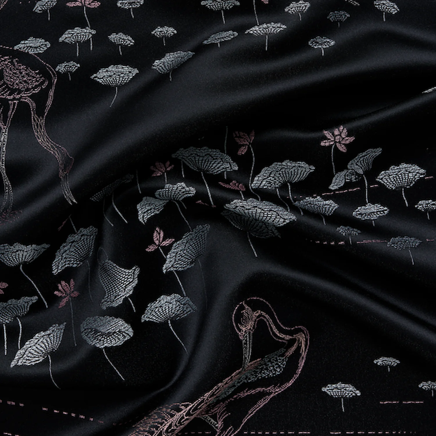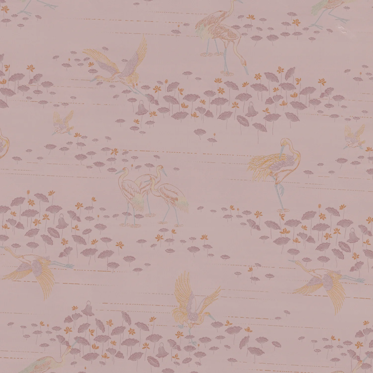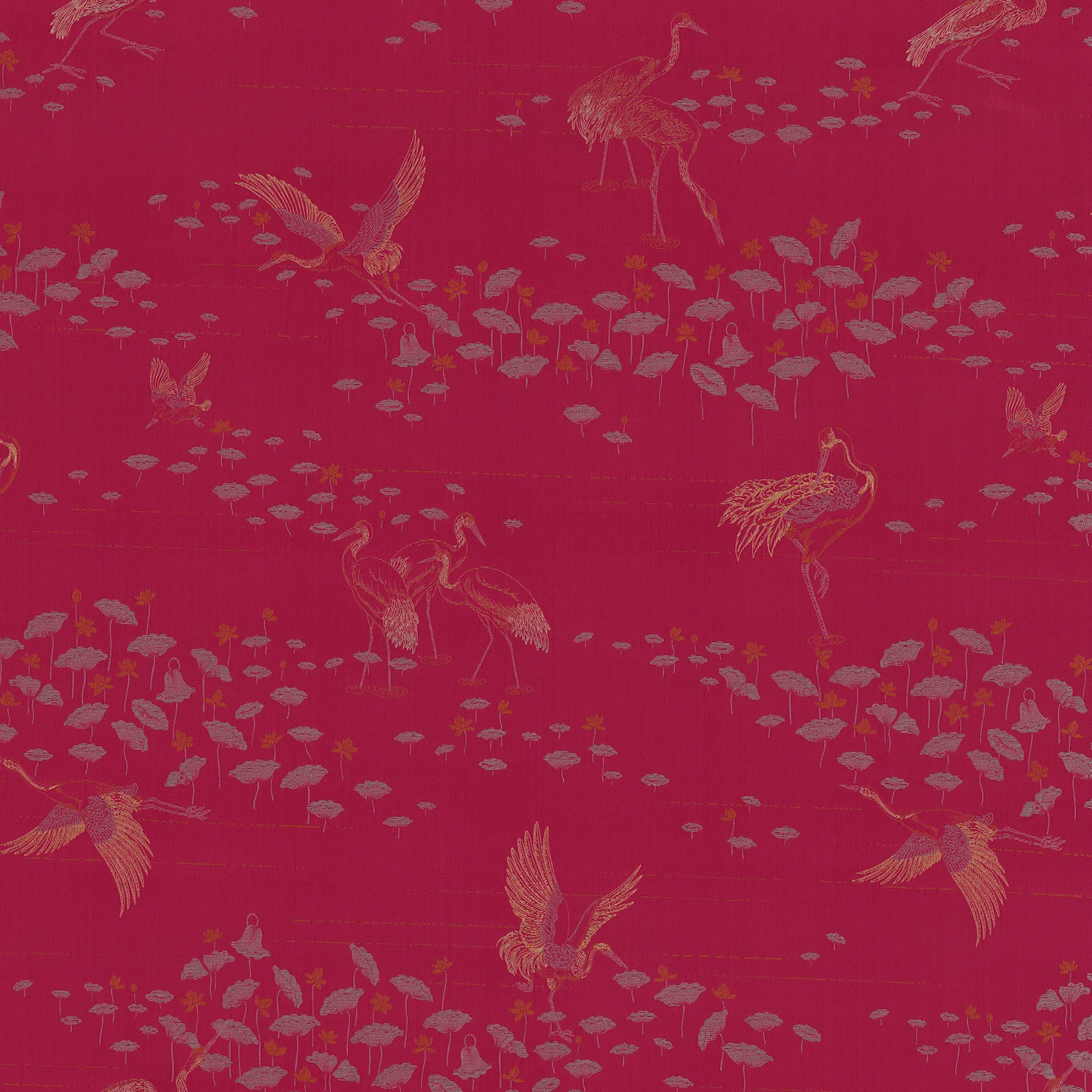 Otori ist ein exotischer Jacquardstoff, der von japanischen Miniaturen auf Textilien und traditionellen Kimonos inspiriert ist, träumerisch und dissonant in seiner Farbgebung. Lotusblüten und -blätter, ruhende oder fliegende Reiher schimmern auf der Satinoberfläche, die sich fast so kühl anfühlt wie das Wasser, das das Muster zeigt. Die Farben sind absichtlich gewagt kombiniert: Himbeerrosa mit Orange, Silber mit butterweichem Creme und Perlweiß mit Eisgrau.