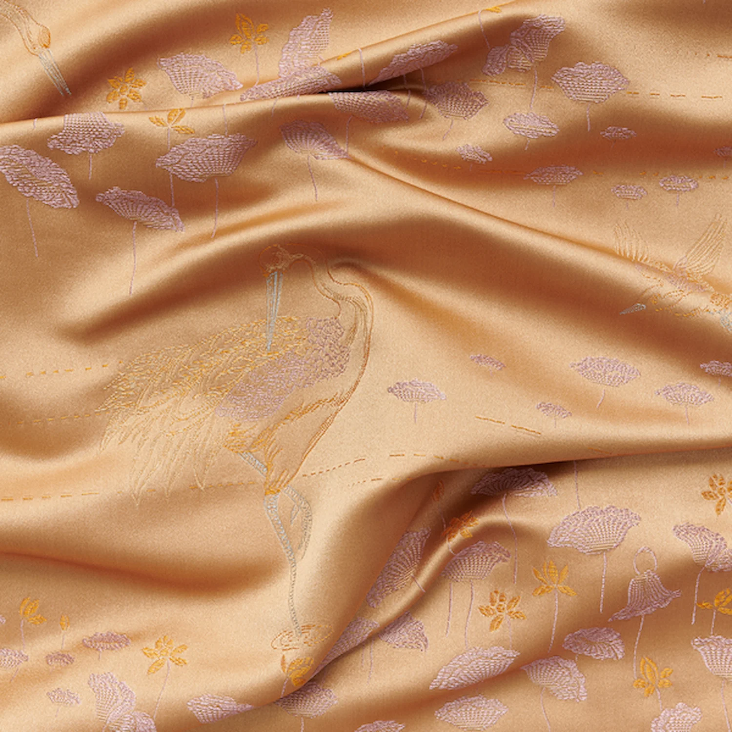 Otori ist ein exotischer Jacquardstoff, der von japanischen Miniaturen auf Textilien und traditionellen Kimonos inspiriert ist, träumerisch und dissonant in seiner Farbgebung. Lotusblüten und -blätter, ruhende oder fliegende Reiher schimmern auf der Satinoberfläche, die sich fast so kühl anfühlt wie das Wasser, das das Muster zeigt. Die Farben sind absichtlich gewagt kombiniert: Himbeerrosa mit Orange, Silber mit butterweichem Creme und Perlweiß mit Eisgrau.