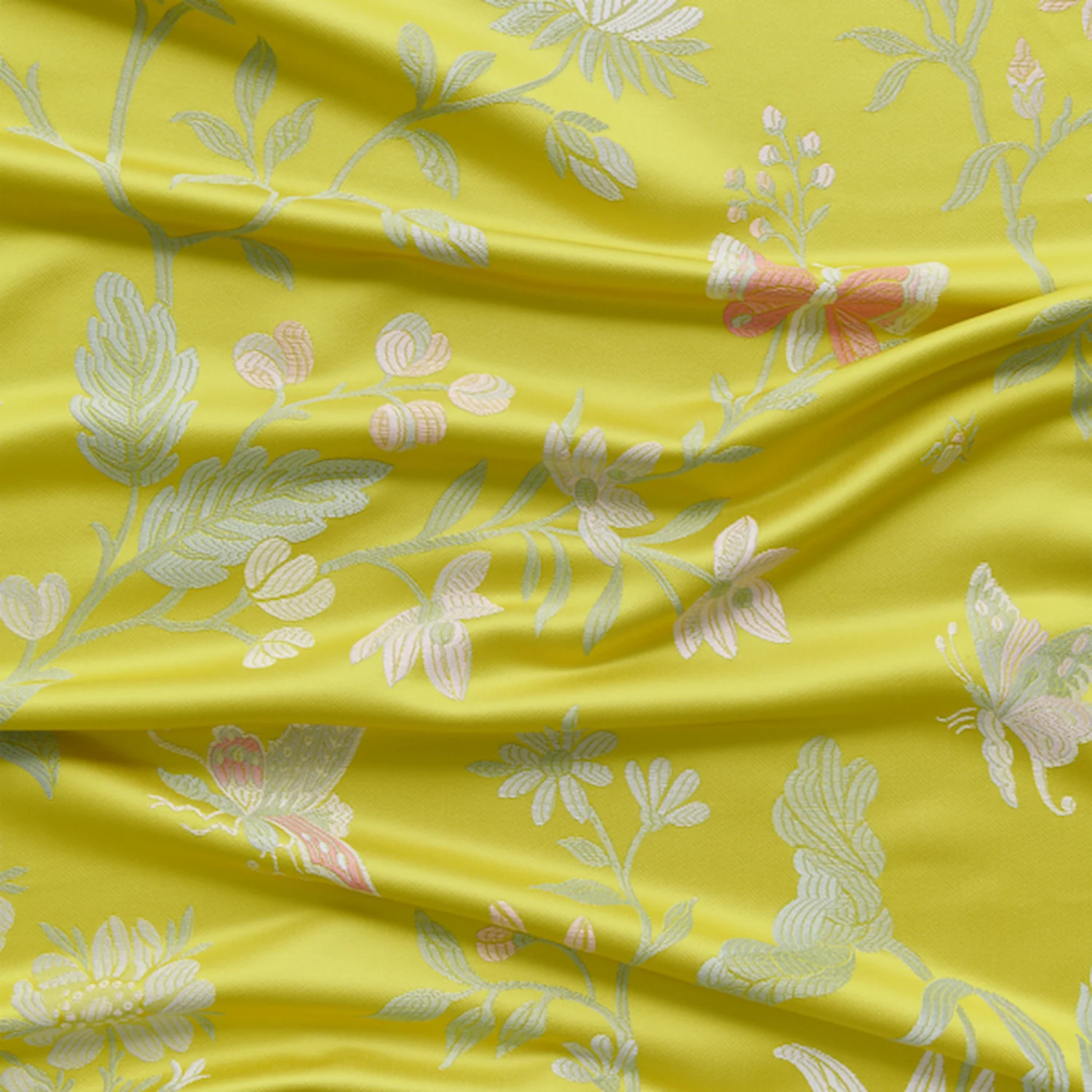 Ein psychedelischer botanischer Zeitreisender. Phantasia ist eine blumige Fantasie mit üppigen Schmetterlingen und Blumen, die sorgfältig auf Hintergrundfarben platziert wurden, was an verschiedene Epochen erinnert. Die reichhaltigen Details des Jacquards verstärken die dezente Farbgebung – Aquamarin aus dem Paris der 1920er Jahre, ein Schwarz, das an Marc Newsons neomoderne Cloisonné-Blütenlounge erinnert, Palazzogelb, Karamell, Perlmutt und warmes Grau.