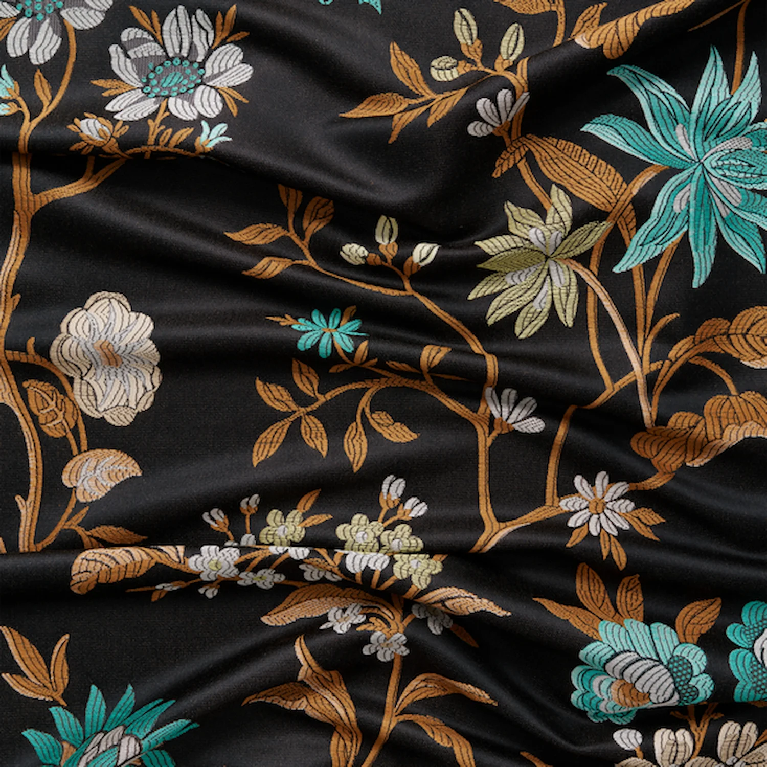 Ein psychedelischer botanischer Zeitreisender. Phantasia ist eine blumige Fantasie mit üppigen Schmetterlingen und Blumen, die sorgfältig auf Hintergrundfarben platziert wurden, was an verschiedene Epochen erinnert. Die reichhaltigen Details des Jacquards verstärken die dezente Farbgebung – Aquamarin aus dem Paris der 1920er Jahre, ein Schwarz, das an Marc Newsons neomoderne Cloisonné-Blütenlounge erinnert, Palazzogelb, Karamell, Perlmutt und warmes Grau.