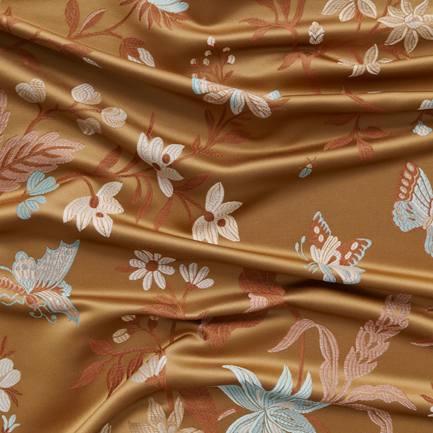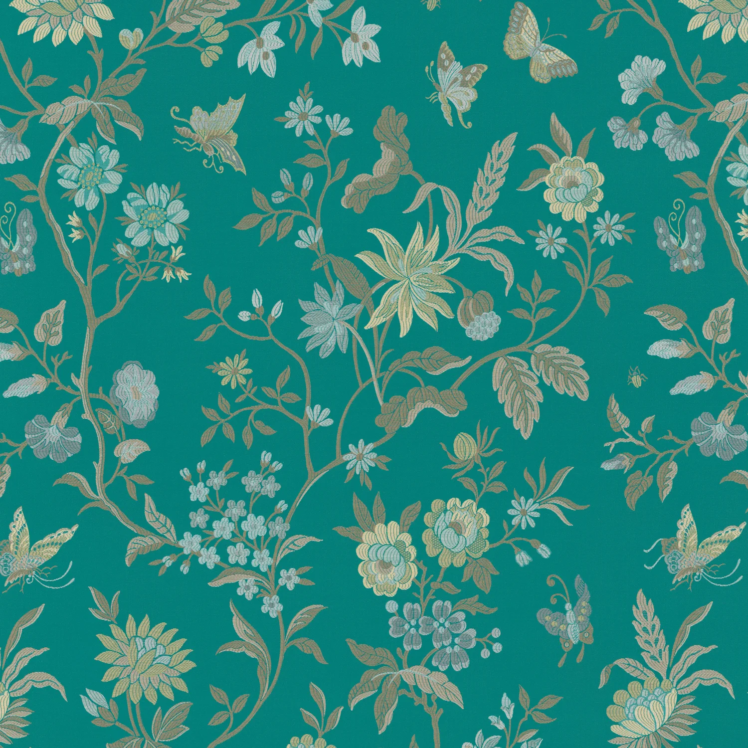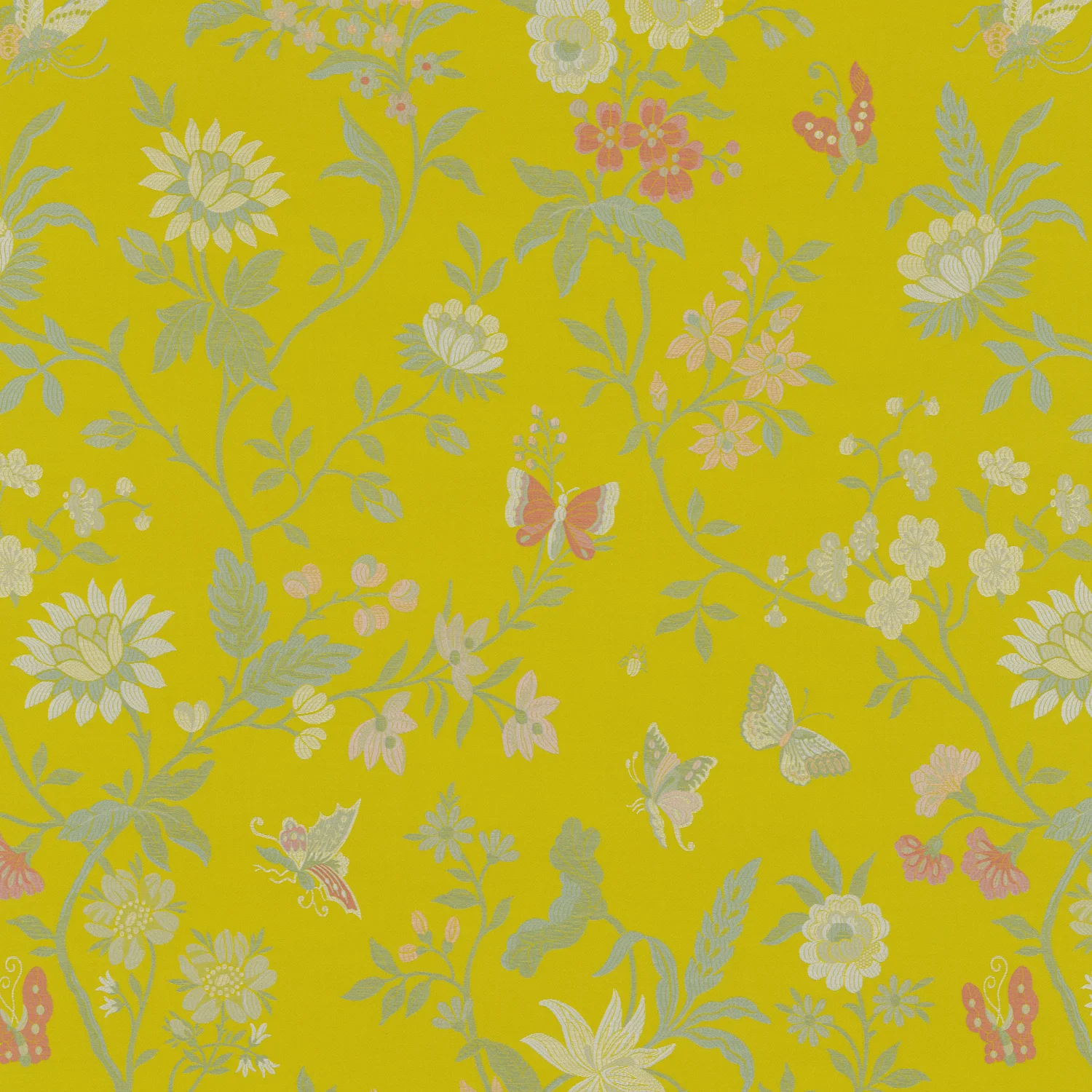 Ein psychedelischer botanischer Zeitreisender. Phantasia ist eine blumige Fantasie mit üppigen Schmetterlingen und Blumen, die sorgfältig auf Hintergrundfarben platziert wurden, was an verschiedene Epochen erinnert. Die reichhaltigen Details des Jacquards verstärken die dezente Farbgebung – Aquamarin aus dem Paris der 1920er Jahre, ein Schwarz, das an Marc Newsons neomoderne Cloisonné-Blütenlounge erinnert, Palazzogelb, Karamell, Perlmutt und warmes Grau.