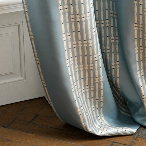 Charakteristisch sind die großzügigen Blockstreifen, die wie elegant aufgereihte Perlenbänder wirken. In aufwendiger Broché-Technik gefertigt, entstehen raffinierte Lichtreflexe, die dem Stoff einen lebendigen Matt-Glanz-Effekt verleihen. Dadurch verändert sich die Optik je nach Lichteinfall und sorgt für eine dynamische, edle Ausstrahlung.