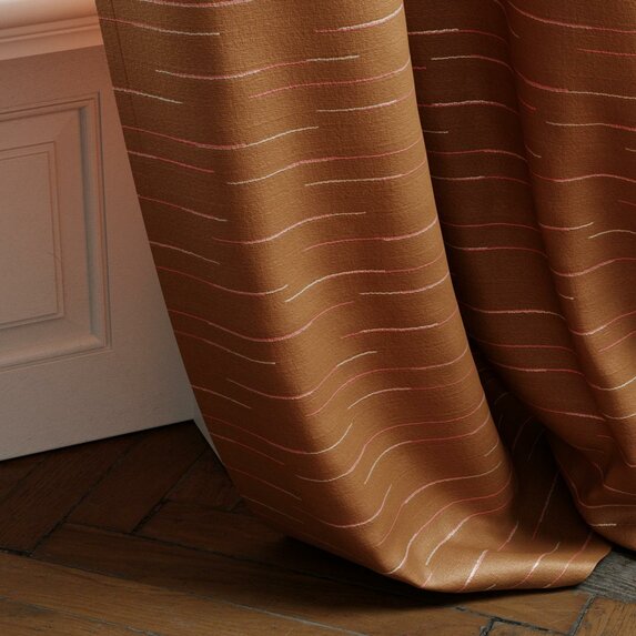 Sein besonderer Reiz liegt in der subtilen Gestaltung: Auf einem leicht schimmernden Fond verlaufen feine, horizontale Linien, die sich wie ein zartes Netz über die Oberfläche legen. Diese Struktur wird durch ein flottierend eingewebtes Garn verstärkt, das eine sanfte Wellentextur erzeugt und dem Stoff eine lebendige Dynamik verleiht.