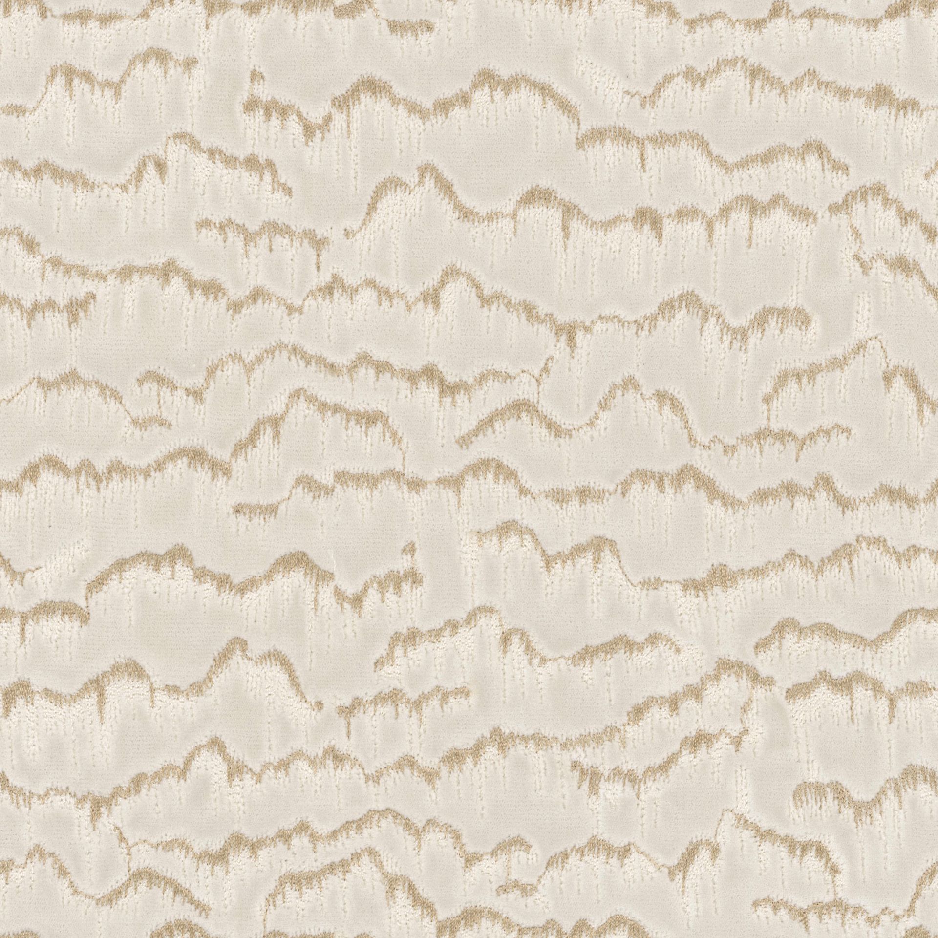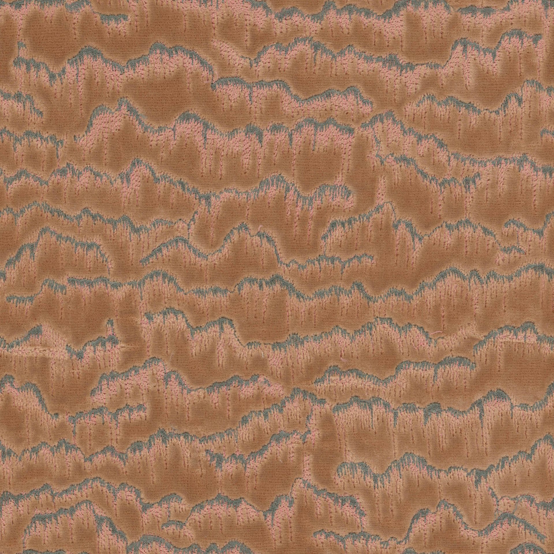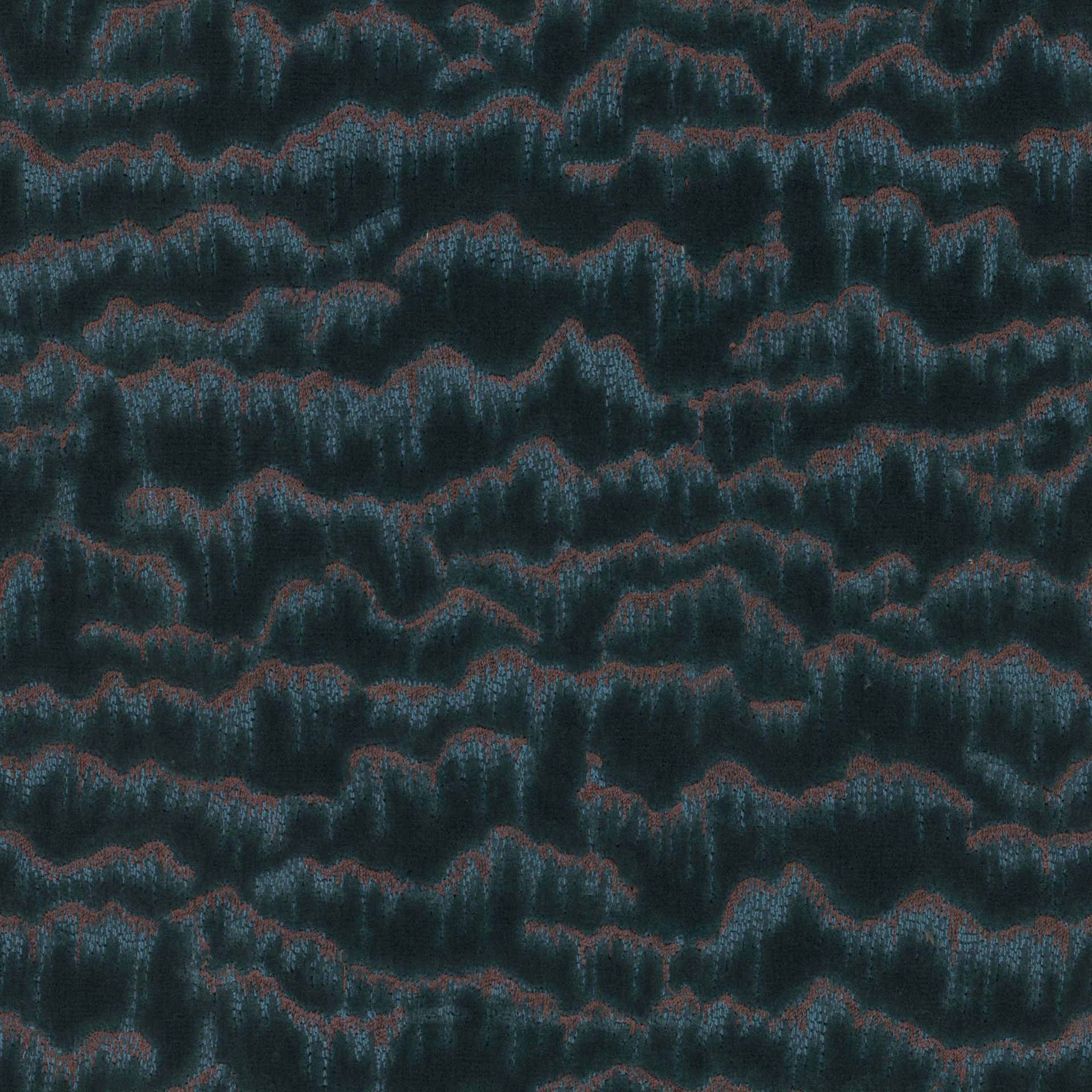 Auf einem weichen Baumwollvelours entfalten sich abstrahierte Gebirgszüge, die in präzise gestickten Linien ausgearbeitet sind. Eine zusätzliche Farbnuance verleiht dem Stoff Tiefe und sorgt für subtile Schattierungen – inspiriert von der Ästhetik japanischer Holzschnitte. Dadurch entsteht eine lebendige Oberfläche, die je nach Lichteinfall immer neue Details offenbart.