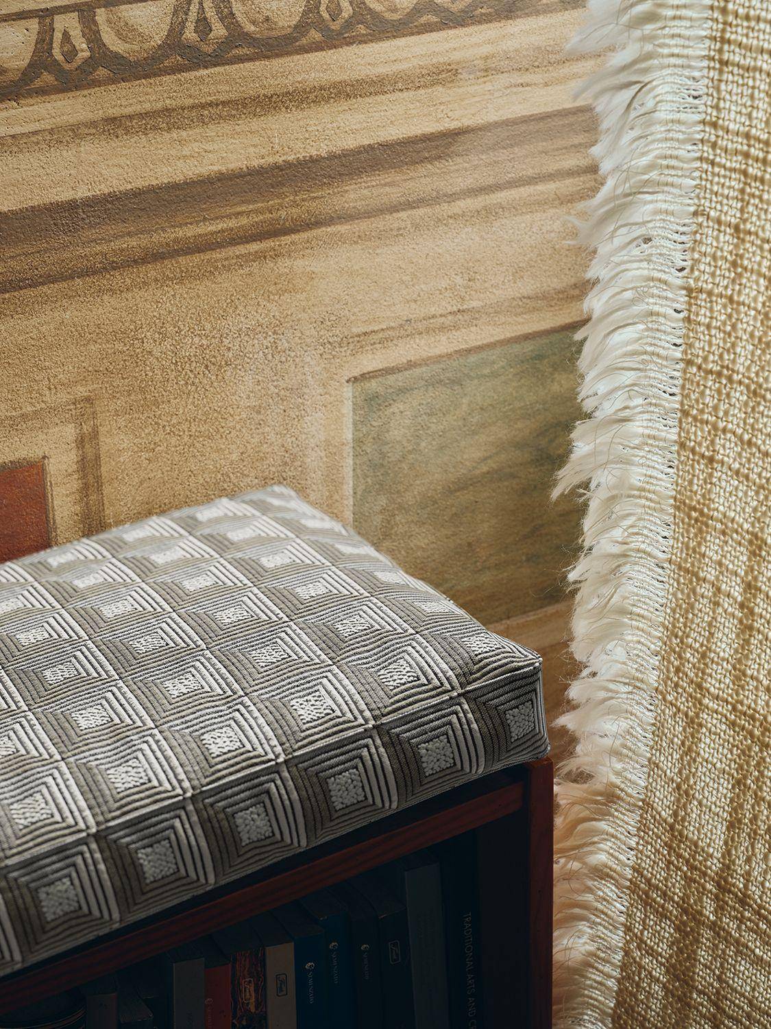 Der Quadra Polsterstoff von Zimmer + Rohde vereint klassische Eleganz mit moderner Funktionalität. Inspiriert vom architektonischen Prinzip der Kassette, erzeugt Quadra eine dreidimensionale Wirkung, die Räumen Volumen und Präsenz verleiht.