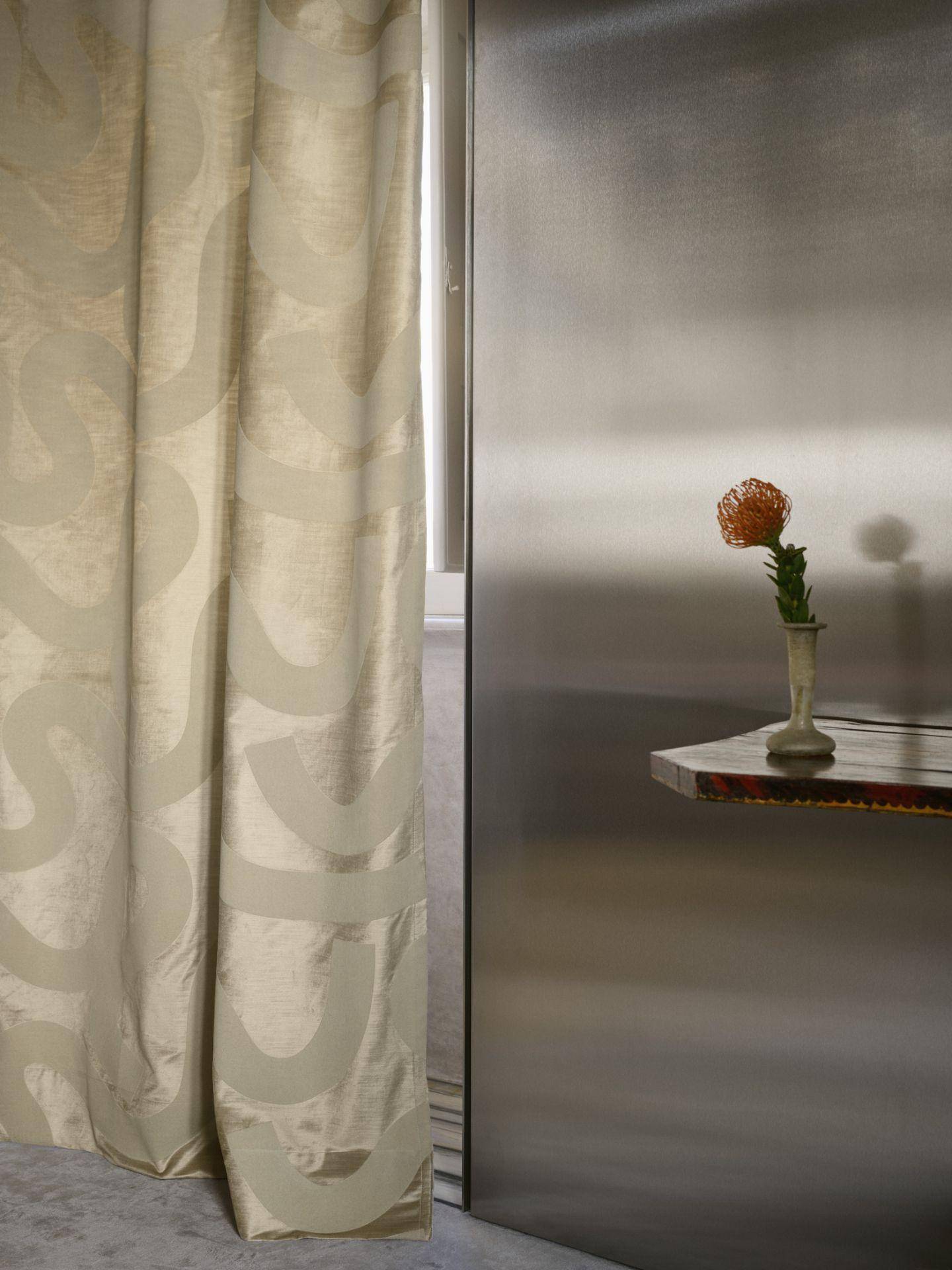 Der Roxy Dekostoff von Zimmer + Rohde steht für Extravaganz, Glamour und edle Materialien. Das großzügige Allover-Design erinnert an die Strahlkraft der Glam-Rock-Ära: breite, schwungvolle Bänder schlängeln sich in dekorativen Wellen über die gesamte Stoffbreite.