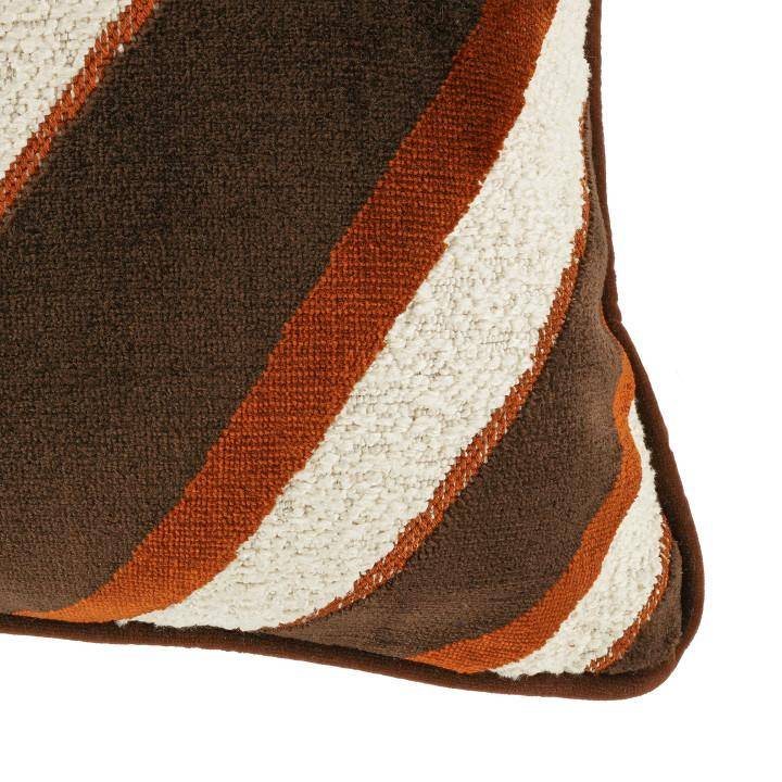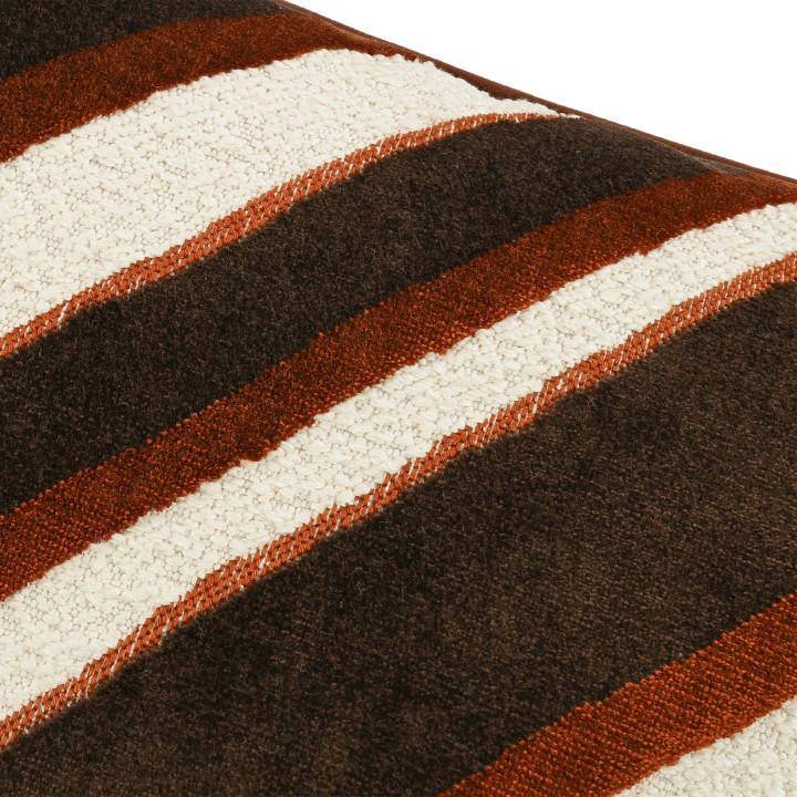 Die Materialzusammensetzung aus 57 % Viskose und 43 % Polyester sowie ein Flor aus 100 % Viskose sorgen für eine besonders weiche, edle Oberfläche mit feinem Glanz. Das diagonale Streifenmuster verleiht dem Stoff eine dynamische Struktur und ein lebendiges Farbspiel, das je nach Lichteinfall unterschiedlich wirkt.