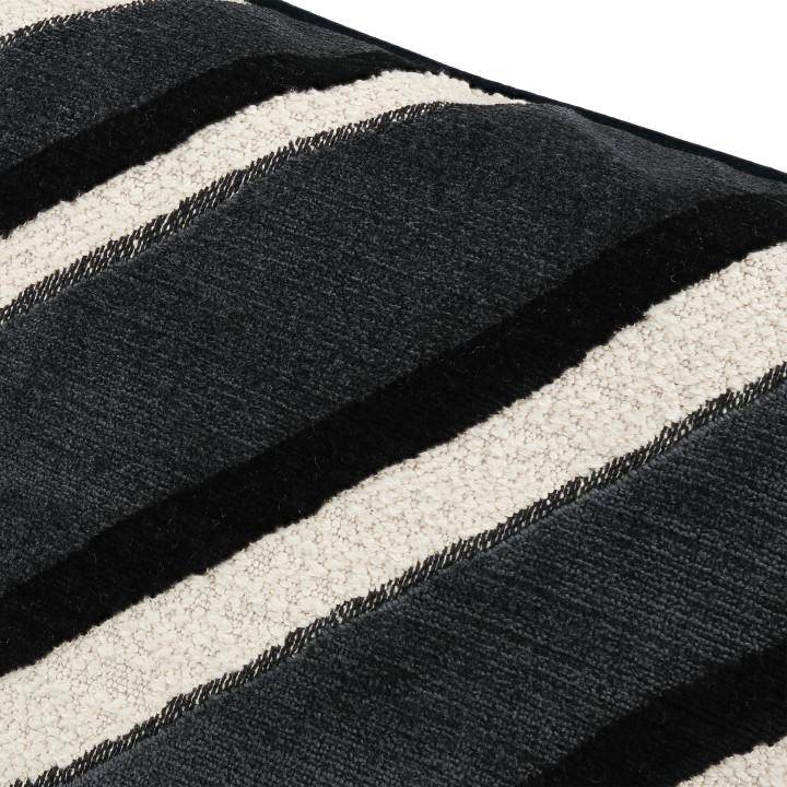 Die Materialkombination aus 57 % Viskose und 43 % Polyester sowie ein Flor aus 100 % Viskose sorgt für eine angenehm weiche, edle Oberfläche mit feinem Glanz. Das diagonale Streifenmuster verleiht dem Stoff eine dynamische Struktur und ein raffiniertes Farbspiel in kühlen Slate-Tönen.